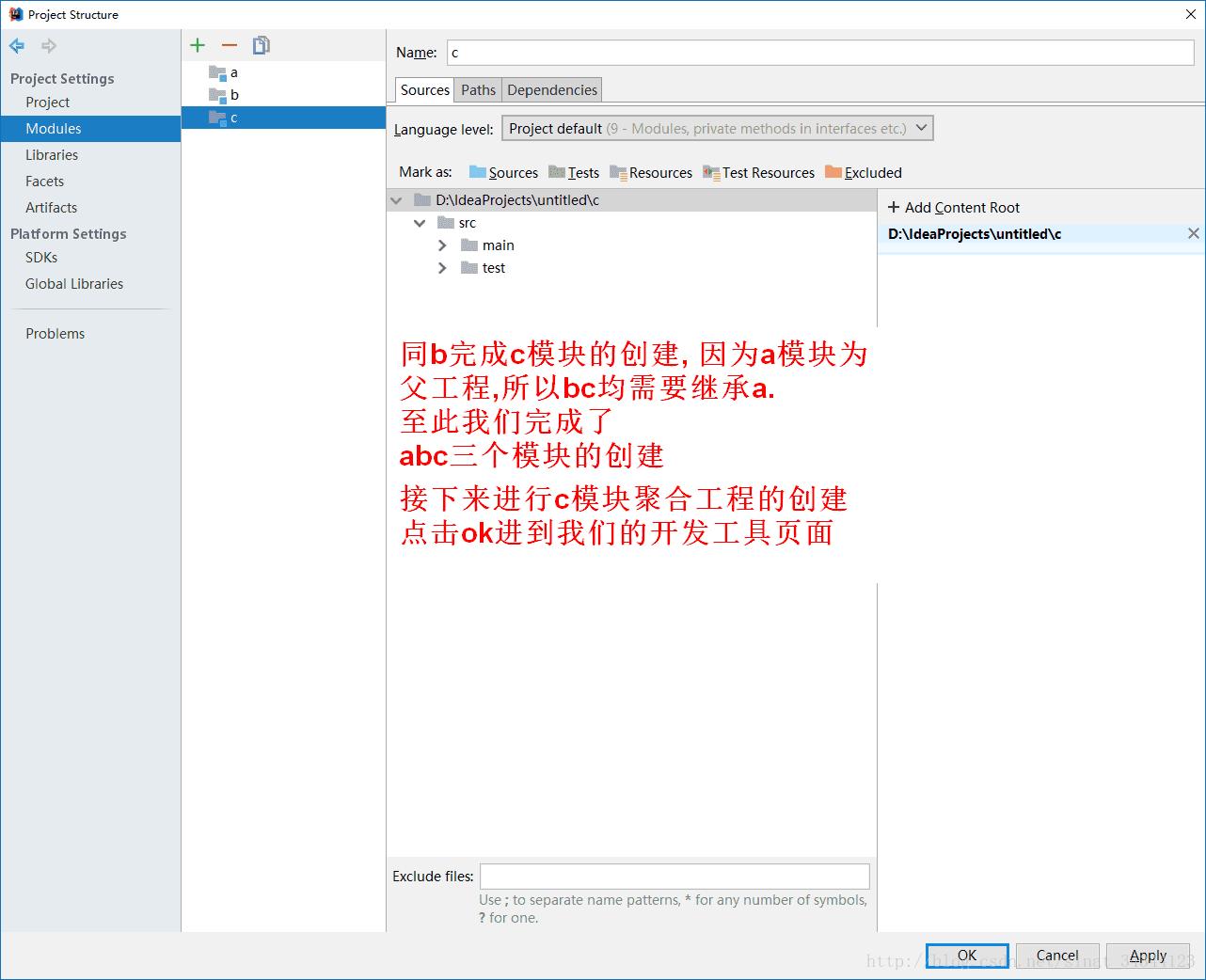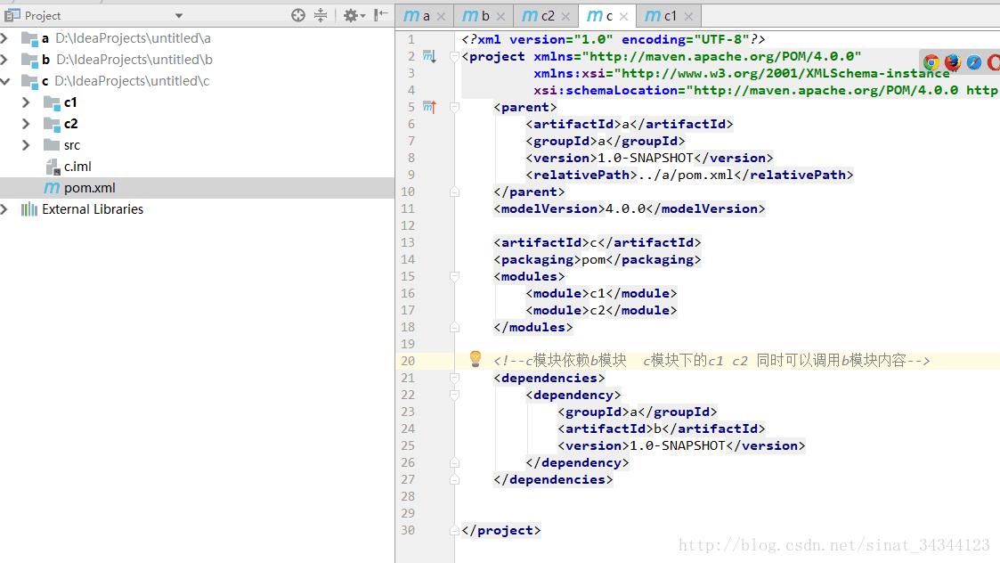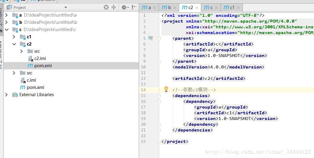 本文以a b c 三个模块为例来搭建项目,以达到通俗易懂的初衷