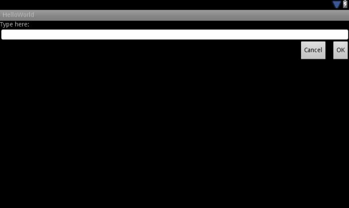 <?xml version="1.0" encoding="utf-8"?> <RelativeLayout xmlns:android="http://schemas.android.com/apk/res/android" android:layout_width="match_parent" android:layout_height="match_parent"> <TextView android:id="@+id/label" android:layout_width="match_parent" android:layout_height="wrap_content" android:text="Type here:"/> <EditText android:id="@+id/entry" android:layout_width="match_parent" android:layout_height="wrap_content" android:layout_below="@id/label"/> <Button android:id="@+id/ok" android:layout_width="wrap_content" android:layout_height="wrap_content" android:layout_below="@id/entry" android:layout_alignParentRight="true" android:layout_marginLeft="10dp" android:text="OK" /> <Button android:layout_width="wrap_content" android:layout_height="wrap_content" android:layout_toLeftOf="@id/ok" android:layout_alignTop="@id/ok" android:text="Cancel" /> </RelativeLayout>