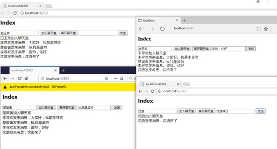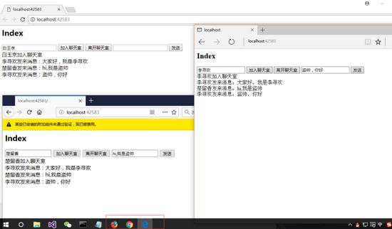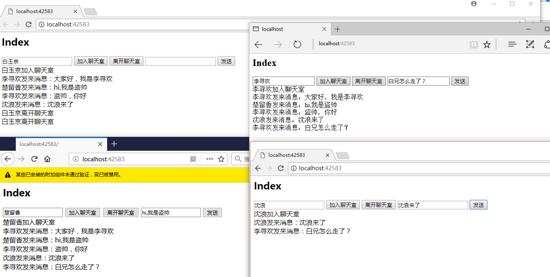 然后连接客户端连接服务器,加入聊天室,分别使用googel(白玉京,沈浪),火狐(楚留香),ie(李寻欢)进行测试,效果如下。
