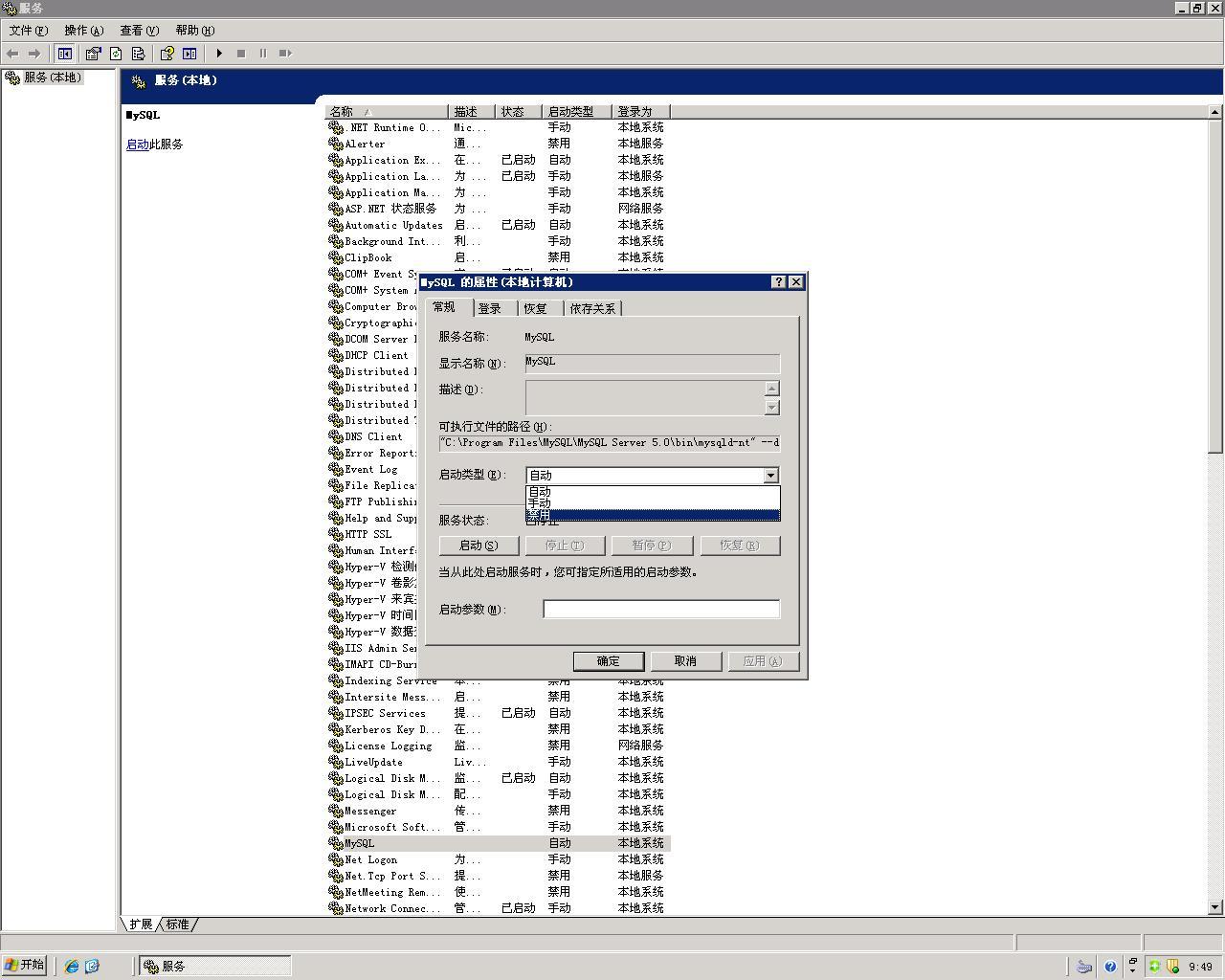操作说明一.主机默认装有的数据库有SQL Server 2005和MySQL,服务默认都是启用的,启用中对CPU的使用和内存的使用都很大,如果主机中不需要数据库或者不需要某一个数据库可以对其服务进行停止,方法如下: