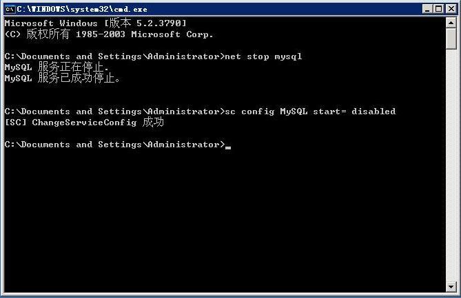 方法二:打开“开始”菜单→“运行”,在运行窗口的输入框里输入“cmd”,确定,在光标处输入“net stop mysql”回车,即停止MYSQL服务,在光标处输入“sc config MySQL start= disabled”回车,即将启动类型改为禁用,如下图(图11)