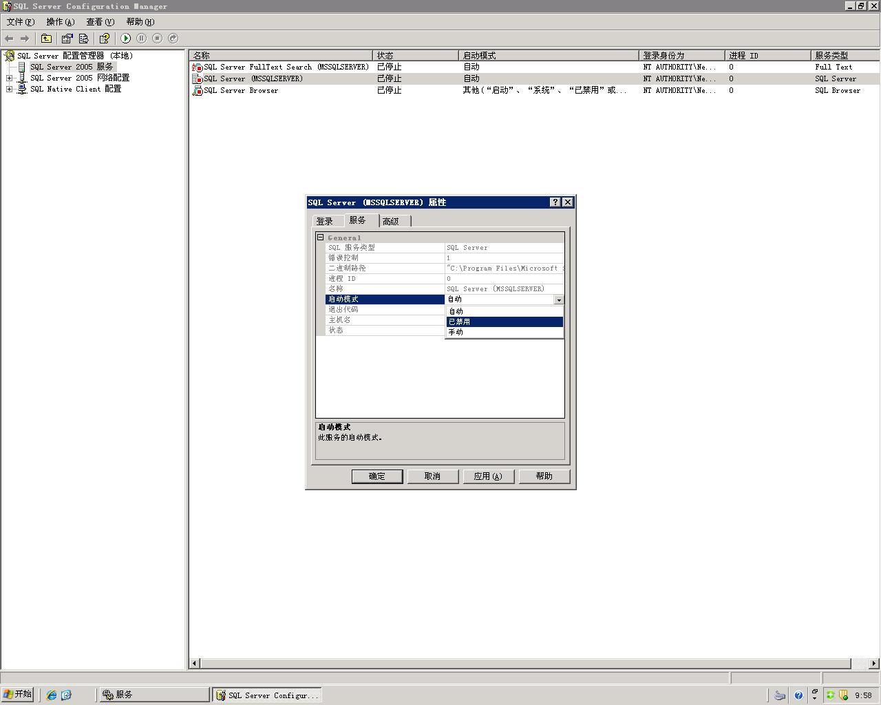 即将SQL Server (MSSQLSERVER)的启动模式禁用用同样的方法在光标处输入“net stop msftesql”和“sc config msftesql start= disabled”即可以把“SQL Server FullText Search(MSSQLSERVER)”的服务停止和启动模式禁用