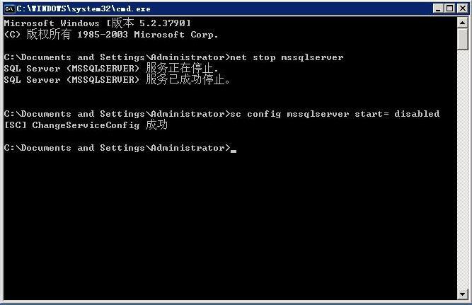 即停止了SQL Server (MSSQLSERVER)服务,接着在光标出输入“sc config mssqlserver start= disabled”并回车 如下图(图6)