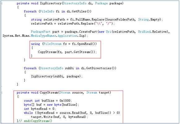 复制源文件的内容到Package里面,为此需要添加一个CopyStream方法。