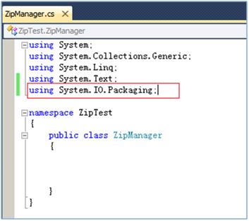在ZipManager.cs中添加对System.IO.Packaging命名空间的引用。
