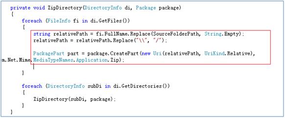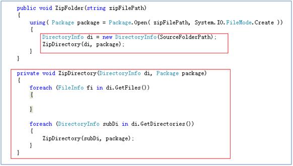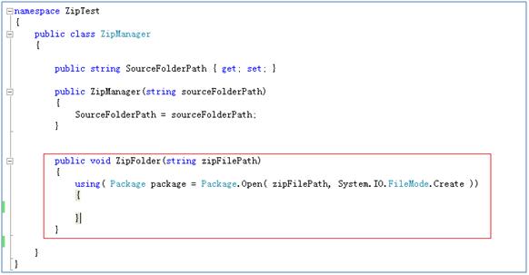 创建一个方法ZipFolder,用来执行实际的压缩操作。在这个方法里面创建一个Package的实例。