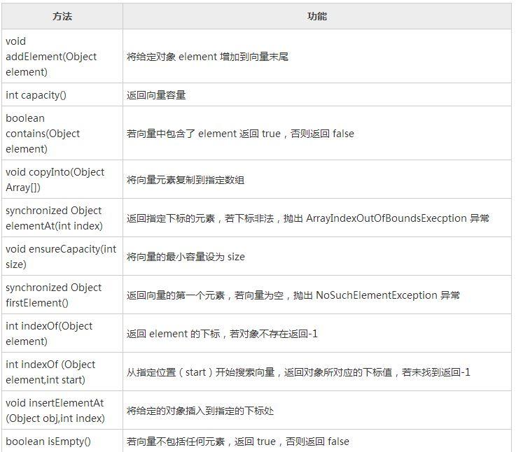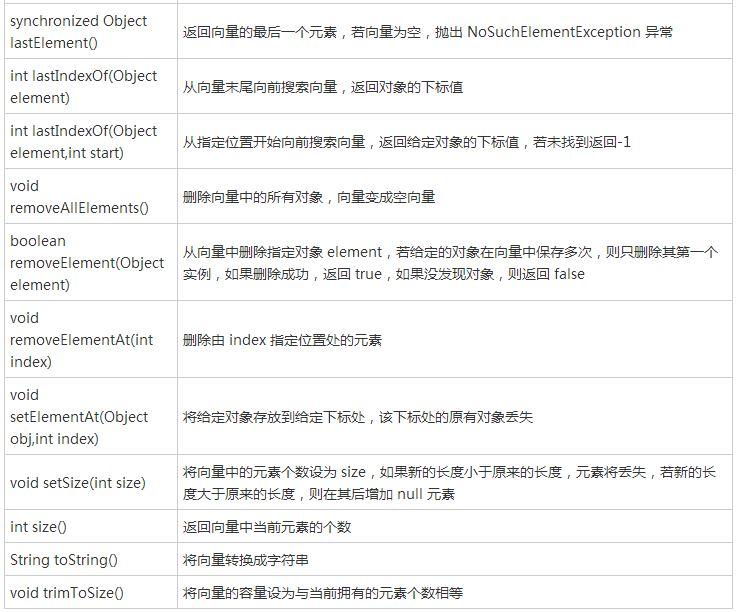 一旦创建了Vector类的实例,就可以用其方法来执行插入、删除以及查找对象等操作,向量类提供了极为丰富的方法,下表给出了一些常用的方法: