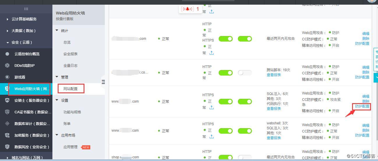 1、进入相关域名的防护配置,我们先来看下调整前的策略,如下图: