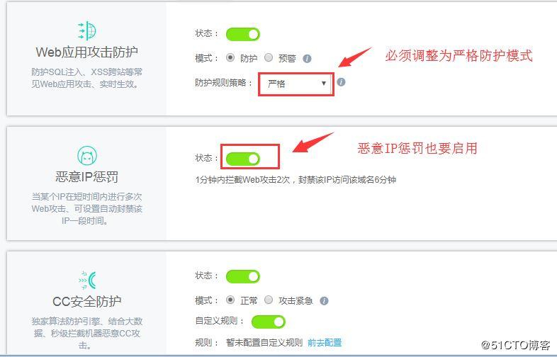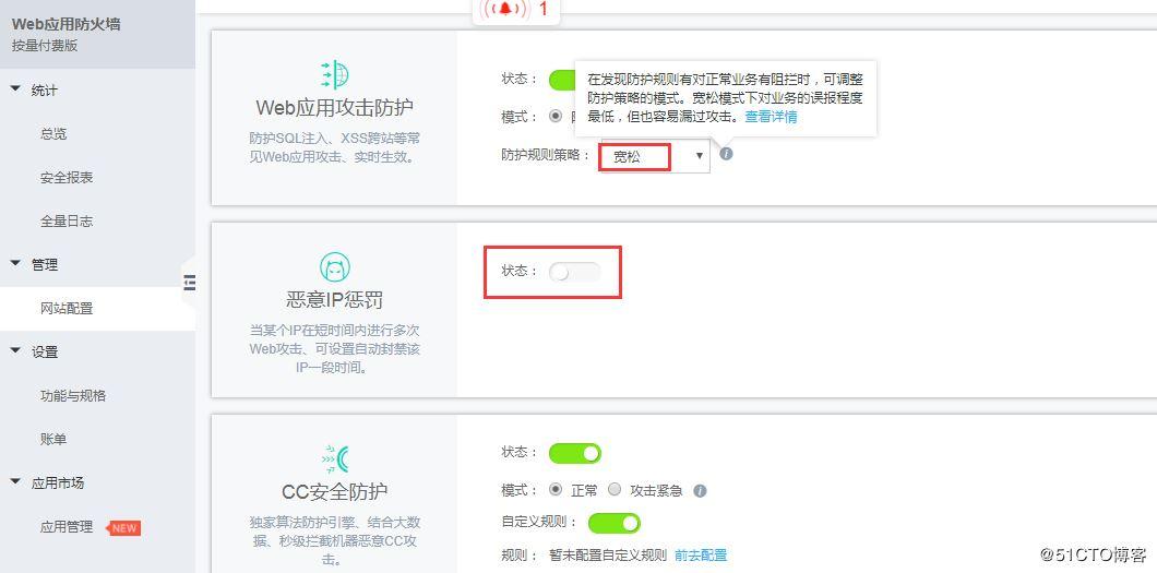 从上图可以看出,“Web应用防护”策略是宽松模式,其主要作用就是防护SQL注入、XSS跨站等常见Web应用,宽松模式下对业务的误报程度最低,但也容易漏过***。“恶意IP惩罚”也没启用。这么宽松的防护措施风险比较大。赶紧先调整吧。