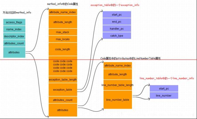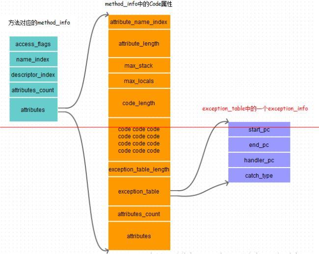 exception_table就是所谓的异常表, 它是对方法体中try-catch_finally的描述。 exception_table可以看做是一个数组, 每个数组项是一个exception_info结构, 一般来说每个catch块对应一个exception_info,编译器也可能会为当前方法生成一些exception_info。 exception_info的结构如下(为了直观的显示exception_info, exception_table和Code属性的关系, 画出了Code属性,的话读者就会更清楚各个数据项之间的位置关系和包含关系):