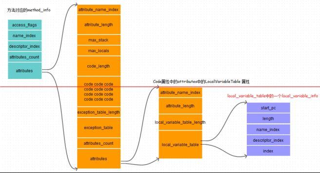 LocalVariableTable 属性建立了方法中的局部变量与源代码中的局部变量之间的对应关系。 这个属性存在于Code属性中。 这个属性是可选的, 编译器可以选择不生成这个属性。该属性的结构如下:(同样给出了全局的位置关系图,LocalVariableTable 在该图的右下角 )