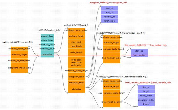 所以会直接或间接的和method_info有联系, 最后给出一张全局图, 这样的话, 读者就比较明确, 一个完整的方法, 是如何在class文件中描述的,由于考虑到复杂性, 这些属性或其他数据项中, 对常量池的引用均未画出: