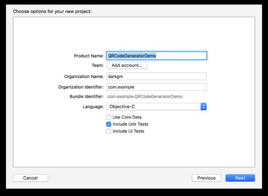 打开 Xcode ,创建一个新的项目( File\New\Project.. .),选择 iOS 一栏下的 Application 中的 Single View Application 模版,然后点击 Next ,填写项目选项。在 Product Name 中填写 QRCodeGeneratorDemo ,选择 Objective-C 语言,点击 Nex t,选择文件位置,并单击 Create 创建项目。