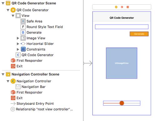 打开 Main.storyboard 文件,在当前控制器中嵌入导航控制器,并添加标题 QR Code Generator :
