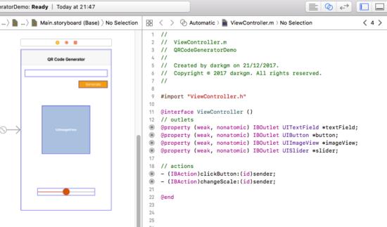 打开辅助编辑器,将storyboard中的元素连接到代码中: