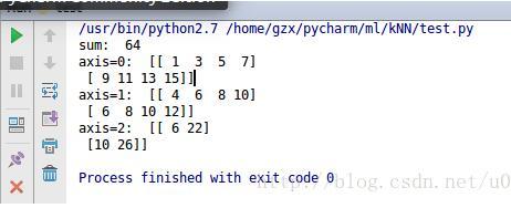 import numpy as np data=np.array([[[0,1,2,3],[4,5,6,7]],[[1,2,3,4],[5,6,7,8]]]) sum=data.sum() sum0=data.sum(axis=0) sum1=data.sum(axis=1) sum2=data.sum(axis=2) print "sum: ",sum print "axis=0: ",sum0 print "axis=1: ",sum1 print "axis=2: ",sum2