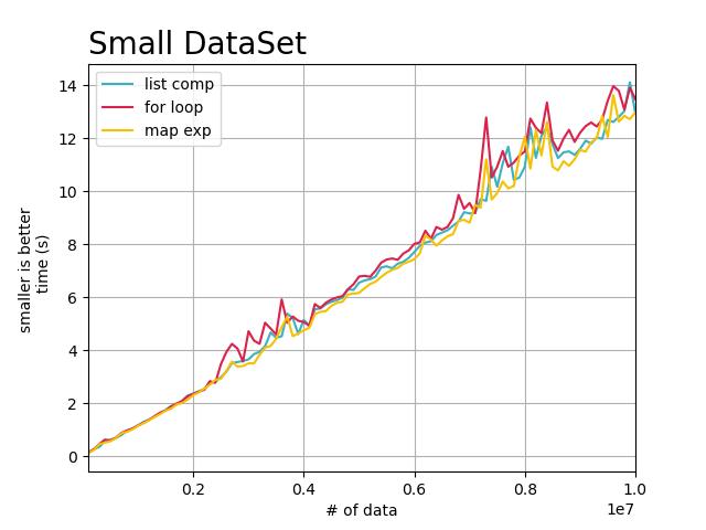 我认为可能跟处理的数据量有关系,大部分场景下,使用者只测试了少量的数据(100W以下,比如这篇文章,就是数据量比较少,导致速度的区别不明显),在少量的数据集下,我们确实看到了map方式比for循环快,甚至有时候比列表解析还稍微快一点,但是当我们逐渐把数据量增加原来的100倍,这时候差距的凸现出来了。
