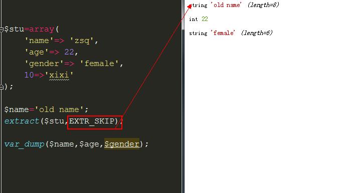 注意,如果当前已经存在变量名,则会发生将已有变量值替换的操作.这个是默认行为.可以修改,通过extact(),第二个参数. 默认为EXTR_OVERWRITE表示重写 //EXTR_SKIP 表示略过.