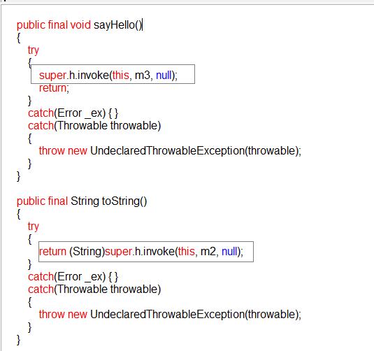 这里的 sayHello 方法是实现的接口 IService,而 doService 方法则是独属于 realClass 自己的方法。但是我们从代理类中并没有看到这个方法,也就是说这个方法没有被代理。