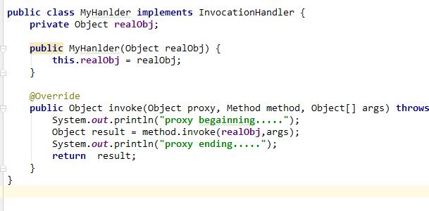 接着,我们定义了一个处理类,它继承了接口 InvocationHandler 并实现了其唯一申明的 invoke 方法。除此之外,我们还得声明一个成员字段用于存储真实对象,也就是被代理对象,因为我们代理的任何方法基本上都是基于真实对象的相关方法的。