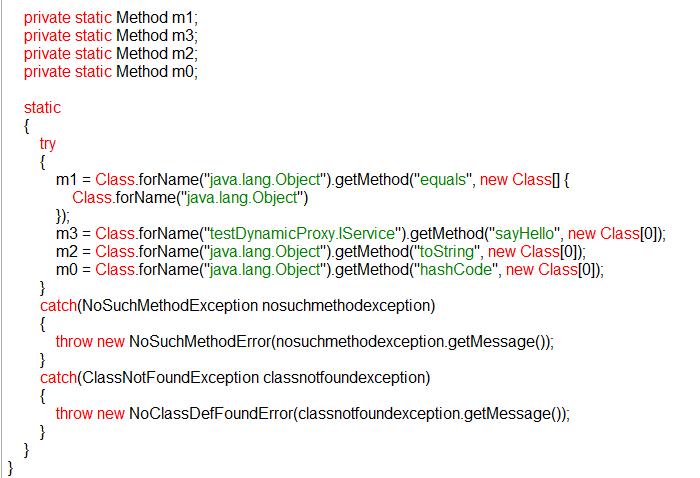 这一块内容也算是代理类中较为重要的部分了,它将于虚拟机静态初始化这个代理类的时候执行。这一大段代码就是完成反射出所有接口中方法的功能,所有被反射出来的方法都对应一个 Method 类型的字段进行存储。