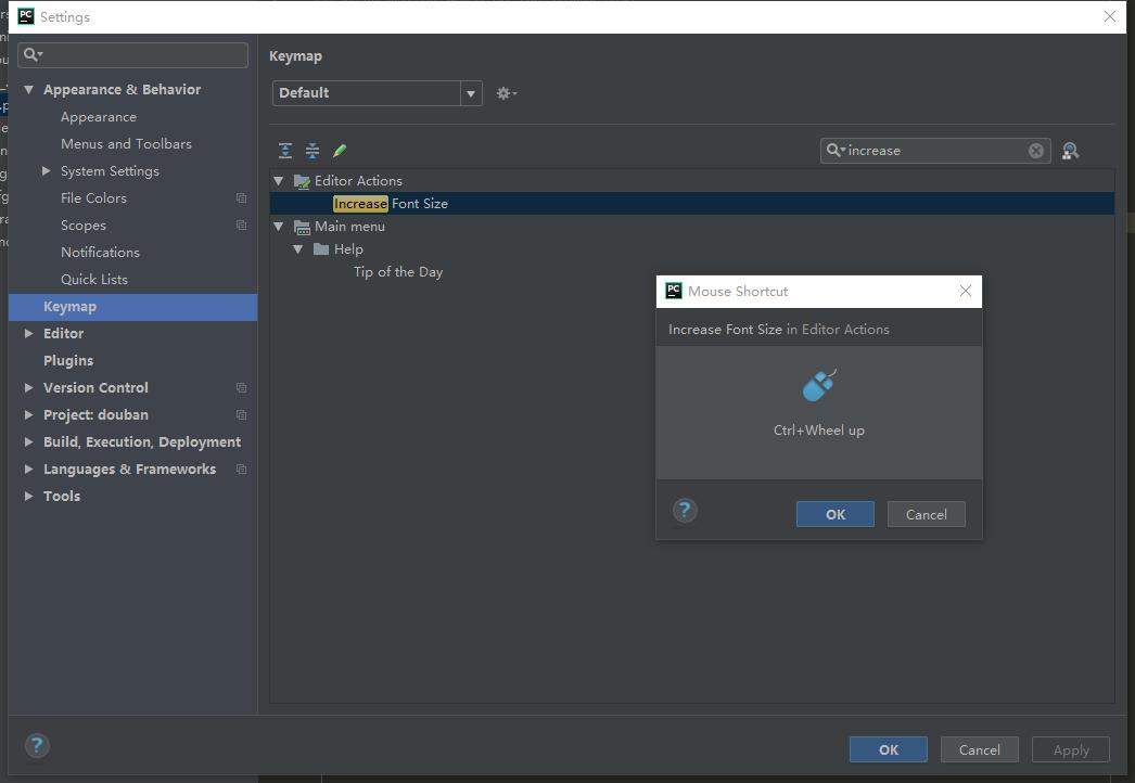 1.打开pycharm中左上角找到File->setting->Keymap->搜索框中输入:Increase Font Size(双击选中)->弹出对话框时选择Add Mouse