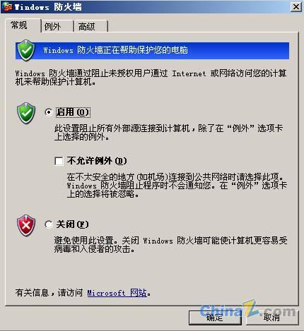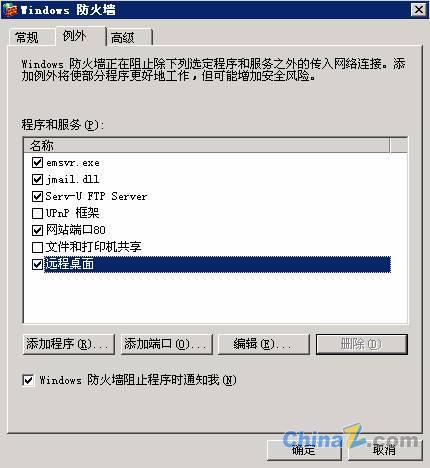 3、启用windows自带防火墙,只保留有用的端口,比如远程和Web、Ftp(3389、80、21)等等,有邮件服务器的还要打开25和130端口。