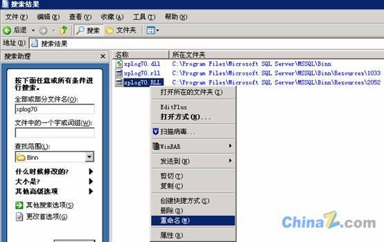 4、安装好SQL后进入目录搜索 xplog70 然后将找到的三个文件改名或者删除。