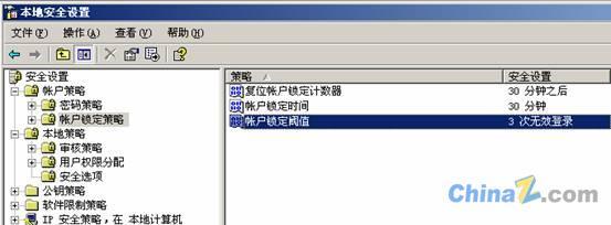 7、配置帐户锁定策略(在运行中输入gpedit.msc回车,打开组策略编辑器,选择计算机配置-Windows设置-安全设置-账户策略-账户锁定策略,将账户设为“三次登陆无效”,“锁定时间30分钟”,“复位锁定计数设为30分钟”。)