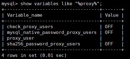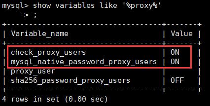 mysql> set global check_proxy_users =on; #开启proxy 下图表示已开启 mysql> set global mysql_native_password_proxy_users = on;