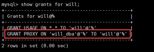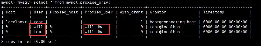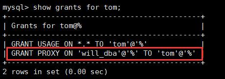 mysql> grant proxy on will_dba to will; mysql> grant proxy on will_dba to tom;