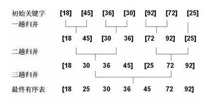 将两个及其以上的有序表合并为一张有序表,把待排序序列通过分治法分为若干个有序子序列,然后每两个子序列合并为一个子序列,经过多次合并后整合为一张有序表。