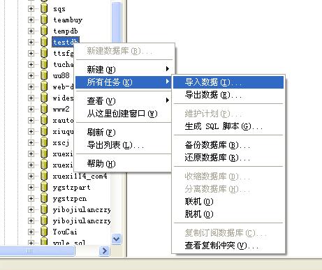4、进入后,选择到您的数据库,如testdb。在上面点右键,"所有任务">>"导入数据",如图4。