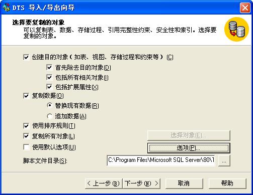 8、这一步可以把"包括扩展属性"和"排序规则"两个选择上。接着去掉左下的"使用默认选项",点击右下角的"选项"来进行配置。