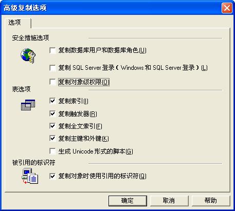 9、图8中点"选项"后会弹出图9,把"复制数据库用户和数据库角色"与"复制对象级权限"两个选项去掉,