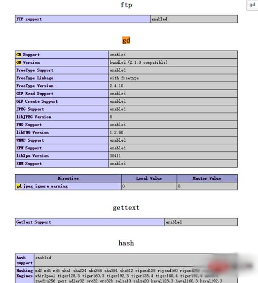 在浏览器中访问到第一步中新建的phpinfo.php文件。Ctrl+F查询gd,如果有出现,就表示gd2库已经加载了,如果验证码还是不显示,请继续看下一步。