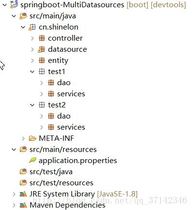 配置好数据源后我们就可以开进行分模块来访问这两个数据源了。首先在src/mian/java目录下创建好各个包,然后开始开发,新建一个datasource包来放置需要访问的两个数据源的代码,然后在新建两个模块包test1和test2,从包名我们就可以看出来这两个包是用来操作这两个数据库,在这两个包下可以分别建立DAO层和service层的包,然后建立一个controller控制层。下面是项目的目录树图。