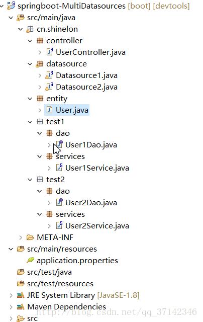 在这里,我们用一个简单的案例来说明,我们访问新建一个spingboot项目,访问test1,test2这两个数据库,首先,我们先看代码。