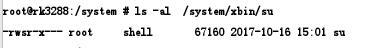 root@rk3288:/system/xbin # ls -al su -rwsr-x--- root shell 67160 2017-10-16 15:01 su