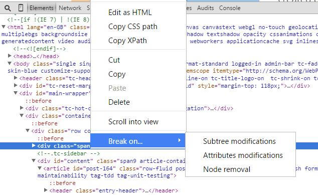 如果你的任务是调试垃圾代码,你可能会有这样的问题:为什么DOM节点在执行过程中发生了改变。Chrome开发者工具提供了一种方便的断点,可用来检测元素树中的节点变化。