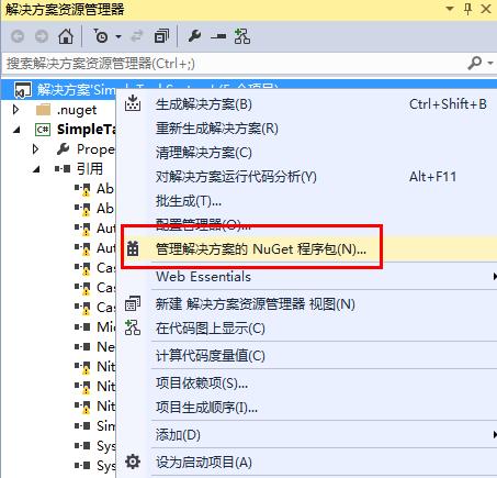 这里我们选择AngularJs和Entity Framework,填入项目名称“SimpleTaskSystem”,点击“CREATE MY PROJECT”按钮可以下载一个zip压缩包,解压后得到VS2013的解决方案,使用的.NET版本是 4.5.1。