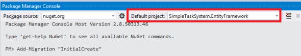 在VS2013底部的“程序包管理器控制台”窗口中,选择默认项目并执行命令“Add-Migration InitialCreate”