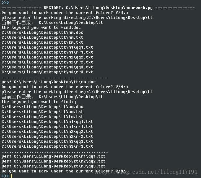 注意:在运行的时候如果选择y,也就是把.py文件所在的目录作为工作目录,此时最好不要把.py文件放到桌面上,因为会遍历桌面上的所有目录及目录下的所有文件,会很大。
