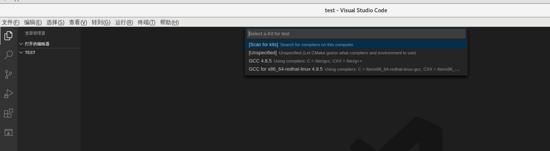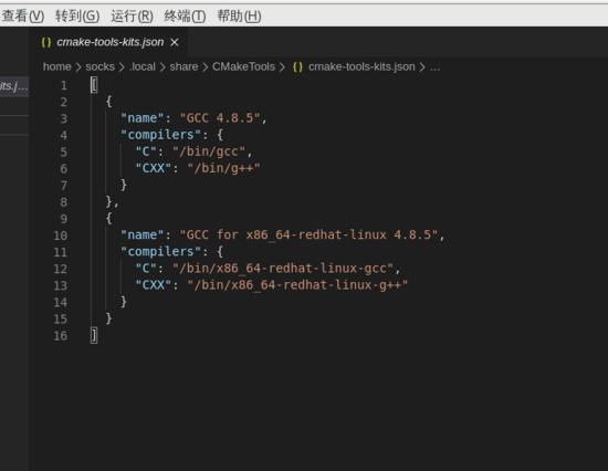 选者需要的编译环境,我这里选者的三GCC 4.85这项,如果没有列出有关GCC编译器的相关选项,则选择Scan a Kit for test(项目名)这一项 如果搜索之后找不到任何一个kit,则在命令窗口中输入cmake : edit User-local CMake Kits,然后根据你所安装的gcc的环境配置,按照图中的格式配置cmake-tools-kets.json。