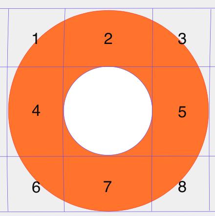 对于这个需求,我一开始也陷入了写死数据的套路,但是在兼容大小圆半径上做了一定的兼容,大致的将大圆切分成 9块 ,然后在除了中间区域外的8块区域再生成一系列的伪标准圆。然后取值时现随机选取8块区域,再随机从块区拿取 伪标准圆 :