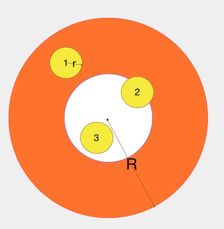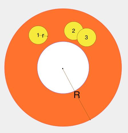 相信很多社交产品中,肯定会存在寻找附近人或者附近商家的需求,类似下图,在大圆和小圆之间(橘色区域)生成一系列的随机圆,并且所有随机圆之间也不能有交集,我暂且称这种圆为标准圆。