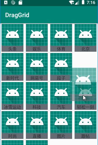 项目中遇到这样个需求:app的功能导航需要可拖动排序,类似头条中的频道拖动管理。效果如下,gif不是很顺畅,真机会好很多。