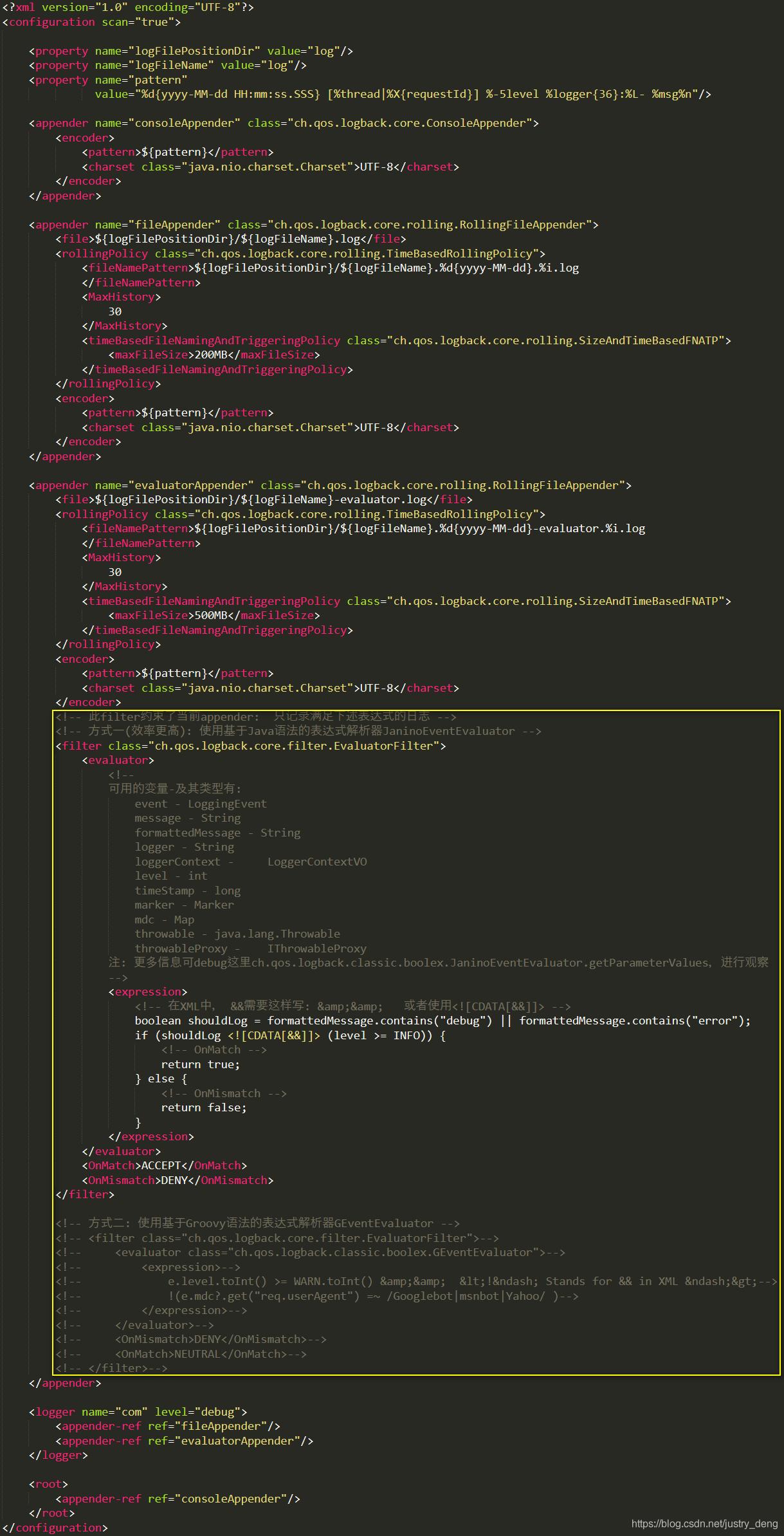 | EvaluatorFilter | Filter | 对满足指定表达式的日志进行记录(或不记录),对不满足指定表达式的日志不作记录(或进行记录) | 是 |