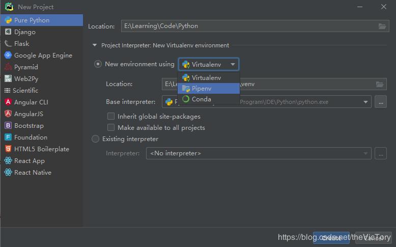在安装完Pycharm并新建一个Python项目的时候会弹出如下对话框,如果不点开Project Interpreter选项则会默认创建一个虚拟环境。点开之后可以看到New environment using选项中有三个环境管理的选项