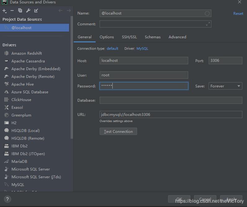 点击侧边栏中的+号选择Data Source选择数据库源,我选择Mysql类型,弹出如下对话框,在其中填入数据库的主机名Host,用户名user,密码password,可以选择要连接到数据库的某一个具体库Database,然后点击OK即可连接到指定主机的数据库。在第一次链接时会提示缺少数据库连接插件,点击安装即可。